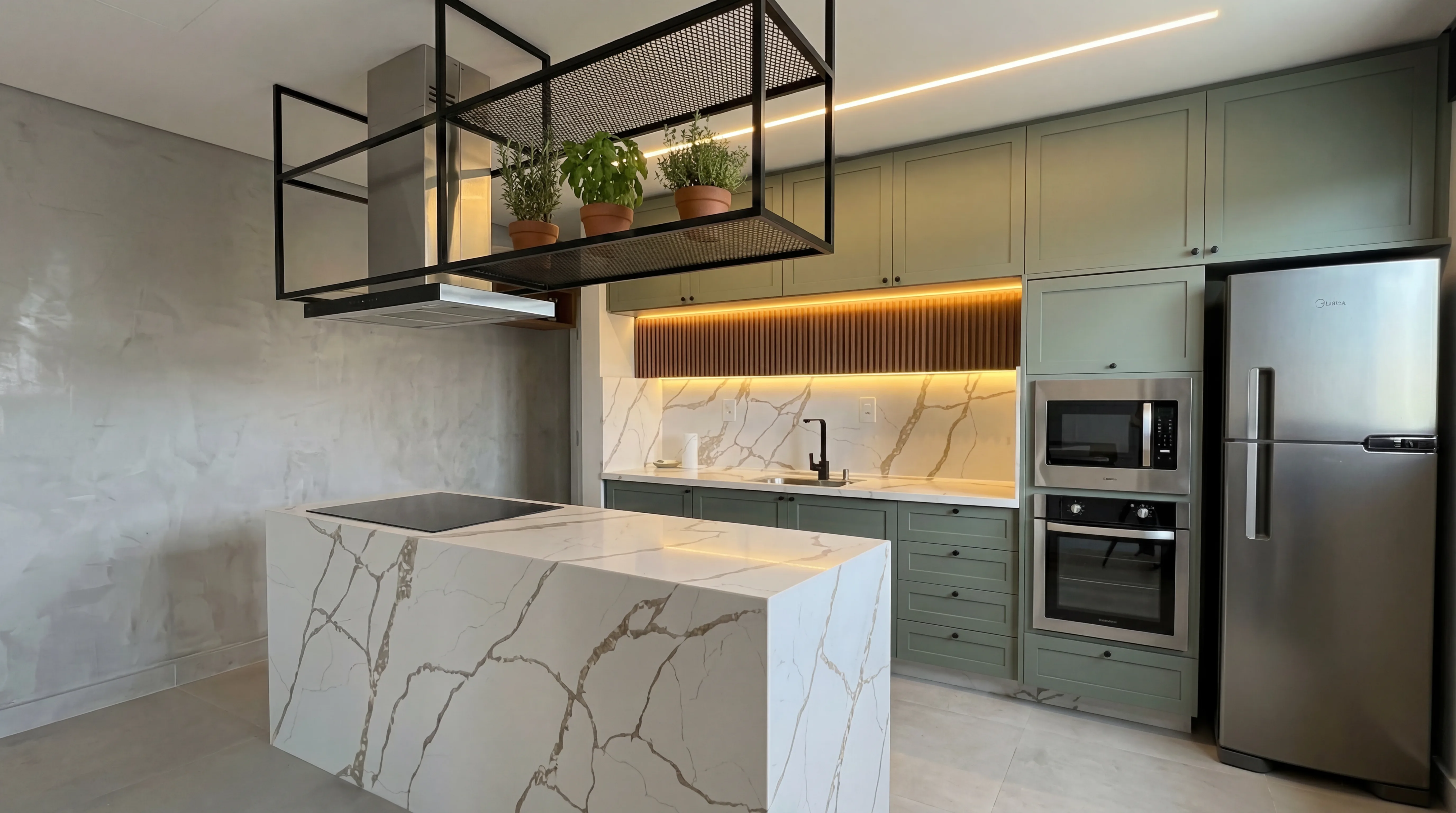Cozinha moderna verde sálvia com ilha em mármore e painel ripado iluminado - Frota Móveis DEPOIS